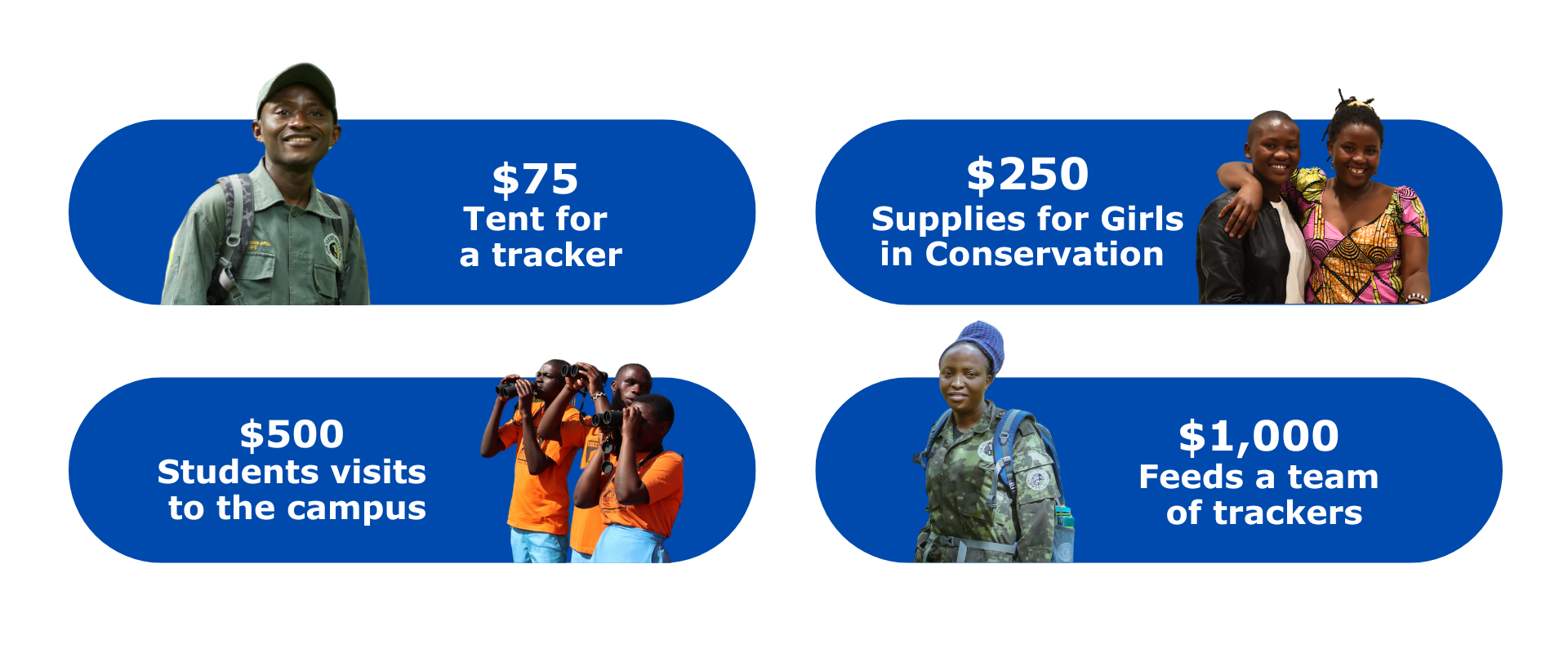 Donate in a tangible way! Whether you choose to help fund a tent for a tracker or a student trip to our Ellen Campus, your money will go where it is needed most.