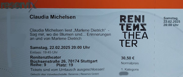 Und dann liest Michelsen im Renitenz-Theater in Stuttgart Marlene Dietrich. Eine großartige Chance mein Wissen über diese große Stilikone zu erweitern. Also kaufte ich Tickets.